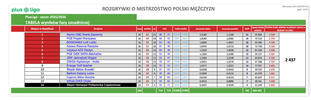 W porównaniu do poprzednich rozgrywek to wzrost o ponad 130 tysięcy widzów łącznie i ponad 500 widzów średnio na mecz. Przypomnijmy, że rekord wszech czasów w PlusLidze należy do PGE GiEK Skry Bełchatów, która w sezonie 2024/2015 zagrała w Atlas Arenie z Asseco Resovią. 30 listopada 2014 na mecz przyszło 11 000 widzów. A rekord w meczu z udziałem klubów PlusLigi to finał TAURON Pucharu Polski z 2025 roku – 14 157 widzów.