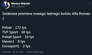 W poniedziałkowe popołudnie odbyła się długo wyczekiwana prezentacja bolidu Alfy Romeo na sezon 2021. Nowa maszyna o nazwie C41 została przedstawiona w Teatrze Wielkim w Warszawie. Całą ceremonię transmitowało kilka stacji telewizyjnych. Jak zatem kształtowały się wyniki oglądalności?