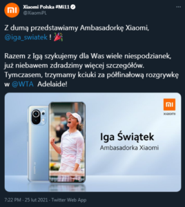 – Cieszę się, że będę z Wami. Wiecie, że moją pasją jest tenis i chcę Wam pokazać, jak sport może rozwijać i zmieniać życie. Chcę podzielić się z fanami Xiaomi tym, co robię, jak się przygotowuję, i jak gram. Może zaszczepię w Was pasję do tego wspaniałego sportu. Już czuję Wasze wsparcie. Do zobaczenia na pokładzie Xiaomi! – skomentowała podpisanie umowy Świątek