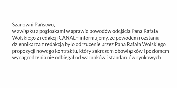 W związku z zaistniałym zamieszaniem, redakcja Canal+ Sport opublikowała na swoim profilu oficjalną informację, która miała na celu wyjaśnić kulisy zakończenia współpracy. Z komunikatu możemy wyczytać, iż Rafał Wolski odrzucił propozycję kontraktu, która nie odbiegała od warunków i standardów rynkowych.