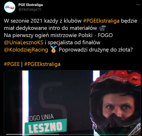 Od kilku godzin PGE Ekstraliga publikuje na swoich kanałach w mediach społecznościowych kolejne filmiki. Swoje intro mają już Stal Gorzów, Sparta Wrocław czy Falubaz Zielona Góra. Co ciekawe, jak dotąd, bohaterami krótkich wideo są Polacy. Po Kołodzieju, do materiałów trafili także Bartosz Zmarzlik, Maciej Janowski oraz Patryk Dudek. Trudno się dziwić, skoro mowa o najbardziej popularnych i rozpoznawalnych żużlowcach, którzy mogą uchodzić za ambasadorów klubów, ligi oraz całej dyscypliny.