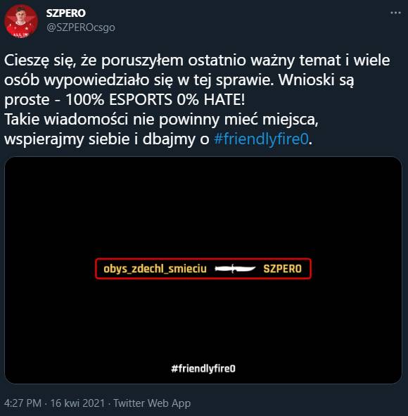 W związku z zaistniałą sytuacją, ruszyła specjalna akcja pod hasłem 100% ESPORTS 0% HATE, którą zainicjowała federacja Honoris. Wielu graczy i organizacji CS:GO zaczyna dołączać się do tego ruchu, publikując odpowiednie wpisy w mediach społecznościowych.