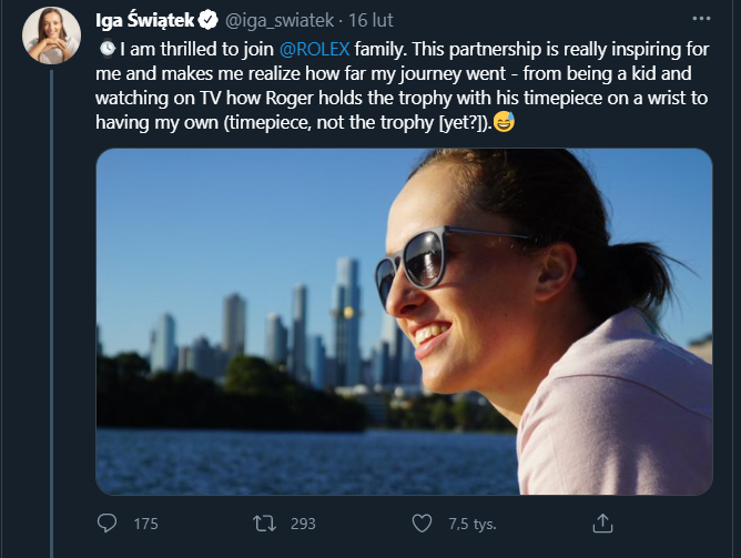 Cieśliński podkreśla jak znakomicie w swoich mediach społecznościowych radzi sobie z tym Iga Świątek. – W sytuacji gdy dużo zdjęć wrzuca z kortu, to PZU czy Asics pojawiające się gdzieś na ubraniu mają regularną ekspozycję, niemniej nie jest ona nachalna. Oczywiście i ona co miesiąc musi wyrobić jeden post, którego klienci oczekują, taki jak legendarne dołączenie do rodziny Rolex albo post z PZU i wartościach narodowych. To lokowanie jednak ginie w szeregu publikacji, związanych z codziennym funkcjonowaniem na korcie.