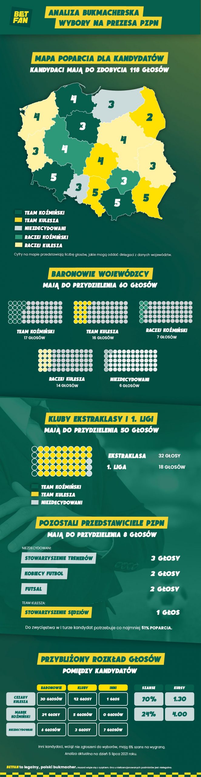 Przyczyną tego układu sił są wyślizgujące się stopniowo z rąk Marka Koźmińskiego głosy związkowych delegatów. Według BETFAN wiceprezes PZPN może liczyć na poparcie już tylko sześciu regionów: pomorskiego, dolnośląskiego, małopolskiego, kujawsko-pomorskiego, wielkopolskiego i świętokrzyskiego. Polskimi „swing-states”, czyli związkami, w których obaj kandydaci mają wyrównane szanse, są Opolski i Warmińsko-Mazurski ZPN. Niewiele wskazuje jednak na to, że głosy ich delegatów rozstrzygną pojedynek. Obecnemu wiceprezesowi PZPN brakuje bowiem atutu, którym dysponuje jego przeciwnik – klubowego zaplecza. Według analityków BETFAN białostocki biznesmen, członek rady nadzorczej Ekstraklasy i wiceprezes PZPN ds. piłkarstwa profesjonalnego, może liczyć na 85% głosów delegatów klubów. Zgodnie z szacunkami bukmachera na Kuleszę zagłosuje też delegat sędziów.
