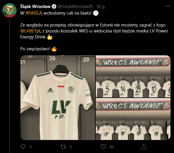 Wczoraj Śląsk Wrocław rozegrał swój pierwszy mecz w ramach Ligi Konferencji Europy. Na boisku wrocławianie wygrali 2:1 w estońskiej Parnawie. Co ciekawe meczowi towarzyszyła pewna zmiana na koszulkach Śląska. W centralnej części trykotów WKS-u zabrakło reklamy głównego sponsora firmy LV BET. Wszystko za sprawą obowiązujących przepisów w Estonii.
