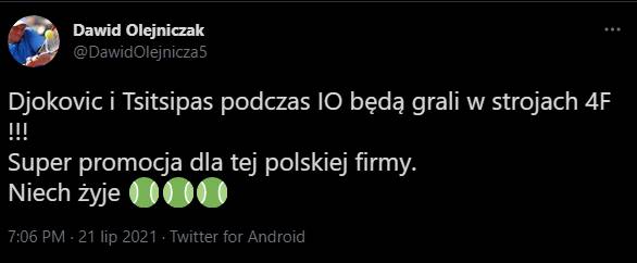 W związku z tym, kilku czołowych sportowców w trakcie igrzysk olimpijskich ubierze stroje 4F. Dla przykładu w samym męskim tenisie mamy Novaka Djokovicia oraz Stefanosa Tsitsipasa.