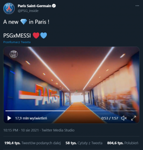 Przejście Leo Messiego do PSG odbiło się szerokim echem w całym świecie futbolu. W social mediach wicemistrzów Francji pojawiło się wiele filmików promujących transfer. Główne wideo prezentujące Messiego na Parc des Princes ma już ponad 800000 polubień na Twitterze i niemal 18 mln odtworzeń.