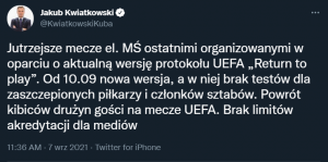 Nadchodzące mecze reprezentacji narodowych podczas kolejnych zgrupowań będą już przebiegać wedle nowych wytycznych, które są efektem wzmożonej na całym świecie akcji szczepień. Zgodnie z nimi, na stadion będą mogli wejść także fani drużyny gości, którym będzie przysługiwać 5% całej puli biletów. Ponadto, zaszczepieni piłkarze oraz członkowie sztabów szkoleniowych nie będą zmuszeni do wykonywania testów na obecność koronawirusa, a przedstawiciele mediów nie będą już limitowani jeśli chodzi o przyznawanie akredytacji.