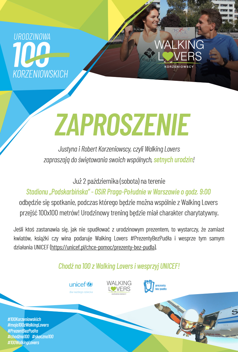 Już 2 października Walking Lovers, czyli Justyna i Robert Korzeniowscy, zapraszają do świętowania swoich wspólnych, setnych urodzin. Tego dnia wszyscy chętni mogą dołączyć do mistrzowskiej pary i wspólnie z nimi przejść 100x100 metrów lub skoczyć ze spadochronem. Jak nie spudłować z urodzinowym prezentem? Zamiast kwiatów, książki czy wina każdy może podarować Walking Lovers #PrezentyBezPudła i wesprzeć tym samym działania UNICEF.