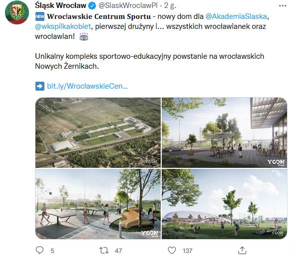 Śląsk Wrocław otrzyma wsparcie z Ministerstwa Kultury, Dziedzictwa Narodowego i Sportu na budowę Wrocławskiego Centrum Sportu. Inwestycja ta ma być unikalnym w skali kraju przedsięwzięciem sportowo-rekreacyjno-edukacyjnym.