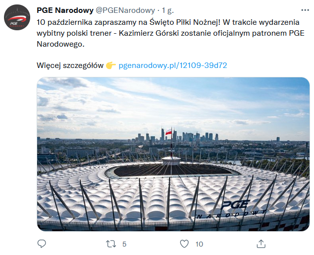 Stadion Narodowy w Warszawie będzie miał wkrótce swojego oficjalnego patrona w postaci legendy polskiej piłki - Kazimierza Górskiego. Specjalne uroczystości zaplanowano na niedzielę 10 października, czyli dzień po meczu Polski z San Marino.