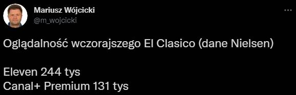Znacznie więcej kibiców śledziło starcie Barcelony z Realem Madryt za pośrednictwem Eleven Sports. Mowa o różnicy wynoszącej ponad 100 tys. osób. Warto jednak pamiętać, że do przedstawionych statystyk nie włączają się transmisje za pośrednictwem internetu, co z roku na rok jest coraz popularniejsze.