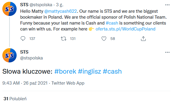 – Cześć Matty. Nazywamy się STS i jesteśmy największym bukmacherem w Polsce. Jesteśmy oficjalnym sponsorem reprezentacji Polski. Zabawne, bo nazywasz się Cash, a #cash to coś, co nasi klienci mogą u nas wygrać – taki wpis pojawił się na profilu STS na Twitterze, a na jego końcu znalazł się jeszcze link do oferty bukmachera na jego stronie.