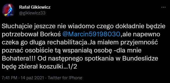 Od kilku sezonów Rafał Gikiewicz występuje w Bundeslidze. Aktualny golkiper Augsburga wpadł na pomysł, by zbierać meczowe koszulki z niemieckiej ekstraklasy na specjalną aukcję charytatywną, która poświęcona jest Marcinowi Borkowskiemu - warszawskiemu ratownikowi medycznemu, który w październiku miał poważny wypadek.