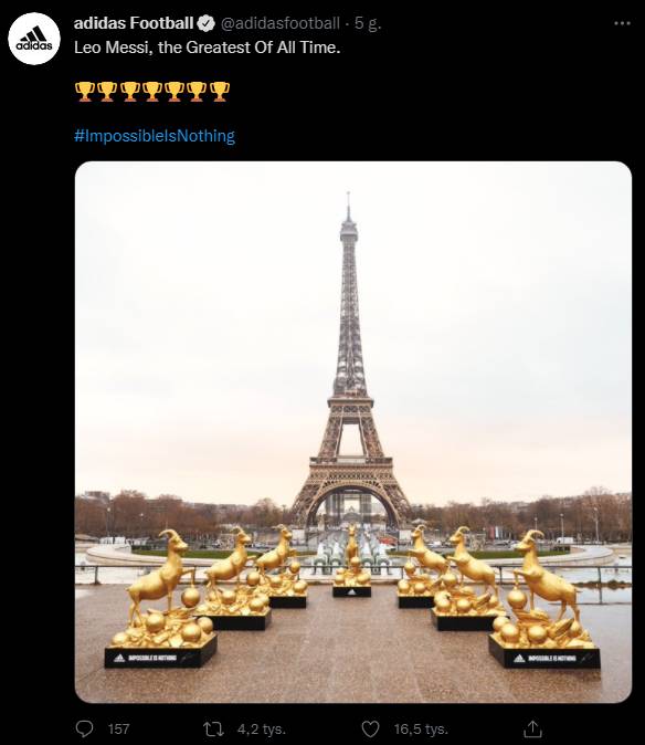Leo Messi po raz siódmy otrzymał Złotą Piłkę, wyprzedzając tym razem Roberta Lewandowskiego. Z tej okazji jeden z głównym sponsorów Argentyńczyka - Adidas postanowił świętować tę ważną chwilę w wyjątkowy sposób.