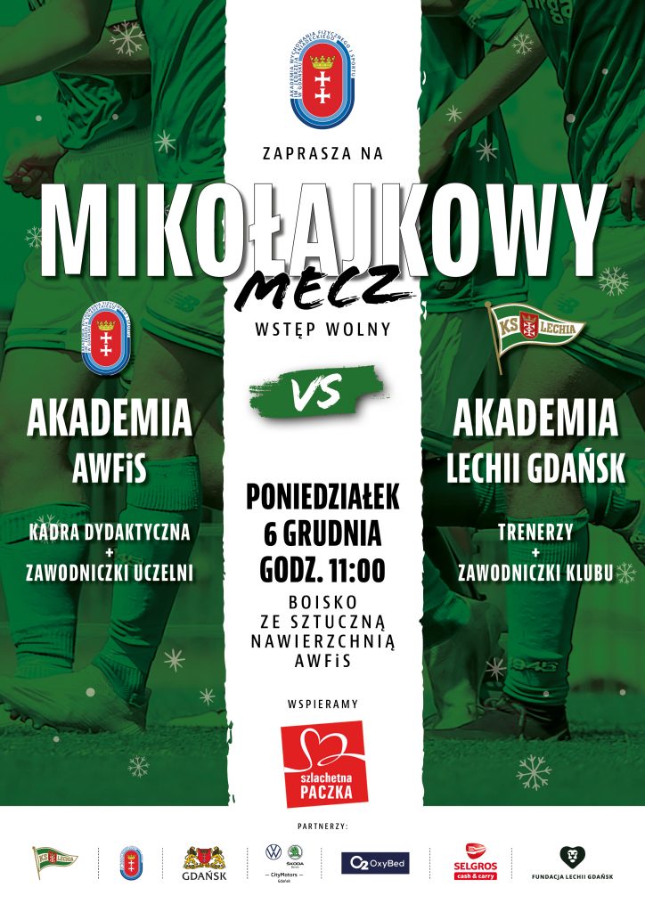 Dnia 06.12.2021 r. o godz. 11.00 na boisku do piłki nożnej Akademii Wychowania Fizycznego i Sportu im. Jędrzeja Śniadeckiego w Gdańsku odbędzie się „Mikołajkowy mecz” pomiędzy trenerami i zawodniczkami Akademii Piłkarskiej Lechii Gdańsk a kadrą dydaktyczną Akademii Wychowania Fizycznego i Sportu w Gdańsku.