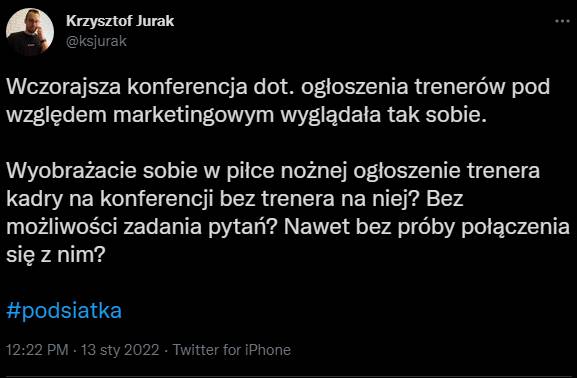 Nic raczej nie stało na przeszkodzie, by połączyć się z nowymi trenerami za pośrednictwem odpowiedniej platformy. Dziennikarze mogliby zadać pierwsze pytania. Tymczasem w momencie, gdy poruszono kwestię oficjalnej prezentacji, padły dość wymijające odpowiedzi prezesa. Na ten moment nie wiadomo, kiedy odbędzie się spotkanie nowych trenerów z mediami.