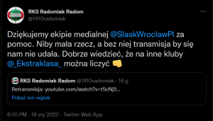 Ostatecznie Radomiakowi udało się jednak zrelacjonować mecz z FK Backa. Z pomocą przyszedł inny klub Ekstraklasy, Śląsk Wrocław i jego zespół medialny. Wieczorem oficjalny profil Radomiaka na Twitterze umieścił krótkie podziękowania dla wrocławian.