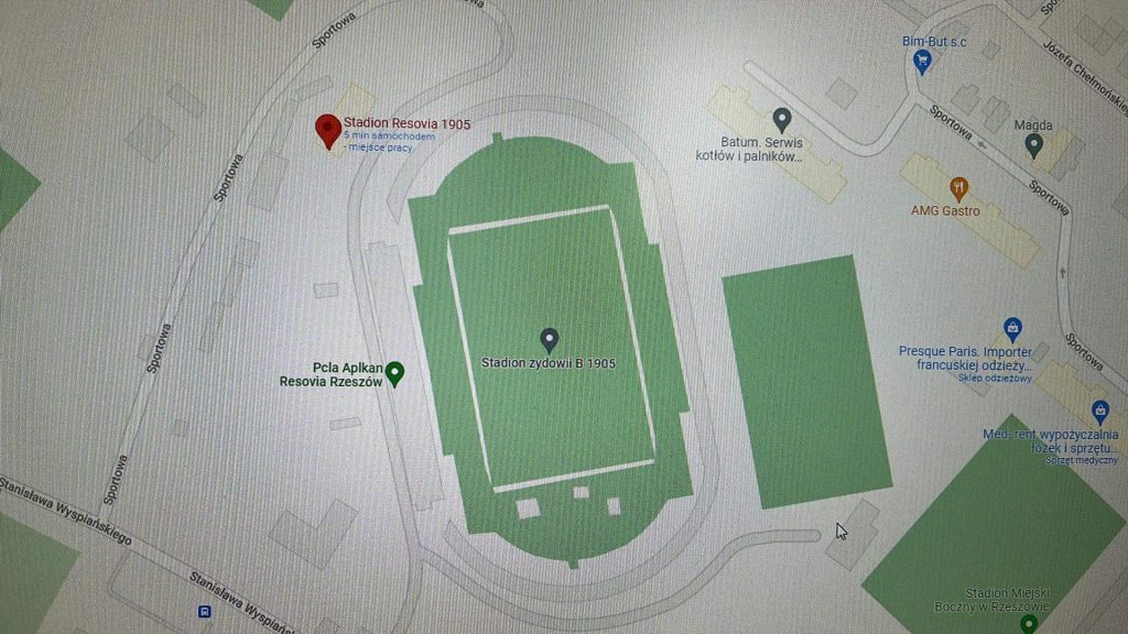 W mapach google stadion Resovii widnieje obecnie jako… „Stadion żydowii B 1905”. Taką informacje wrzucił na Twittera Paweł Bukała, rzecznik klubu. Warto dodać, że wpis pojawił się o 12:40, a po dwóch godzinach nadal można ten sam obrazek zobaczyć na mapie.