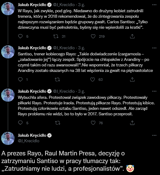 Rayo Vallecano pod koniec stycznia zatrudniło wspomnianego Carlosa Santiso w drużynie kobiet. Kilka lat temu ów trener prowadził klub Arandina w Tercera Division(czwarty poziom rozgrywkowy). Wówczas nawoływał graczy swojego zespołu do… zbiorowego gwałtu na kobiecie. Według niego taki czyn miał budować jedność zespołu. Sprawę dobrze opisał Jakub Kręcidło na Twitterze.