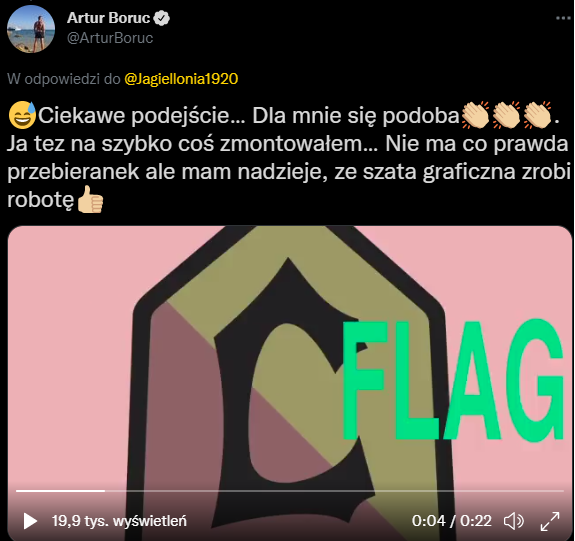 Zabawny film doczekał się do szybkiej odpowiedzi bramkarza. Artur Boruc wrzucił szybki film, w którym odniósł się do białostockiego klubu w nieco inny sposób. W tle piosenka „Nie ma fal”, na środku odwrócony herb Jagiellonii oraz napis „Nie ma flag”. To ostatnie to odniesienie do sytuacji sprzed kilku lat, gdy kibice Legii ukradli kilkadziesiąt flag fanom Jagi. Do dzisiaj to przedmiot wielu niesnasek na linii Warszawa – Białystok.