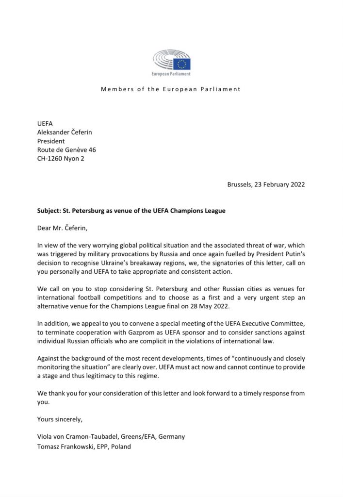 Tomasz Frankowski i pozostali europosłowie domagają się pierwszych kroków przeciwko agresorowi. Chodzi o odebranie Rosji organizacji finału Ligi Mistrzów. Przypomnijmy, że najbliższy odbędzie się 28 maja w Sankt Petersburgu. Co prawda w kuluarach mówi się o ewentualnym przeniesieniu meczu do Londynu, to jednak UEFA póki co nie komentowała sprawy. Teraz jednak sprawy nabrały mocy, a wobec agresji Rosji na Ukrainę, może dojść do zmiany.