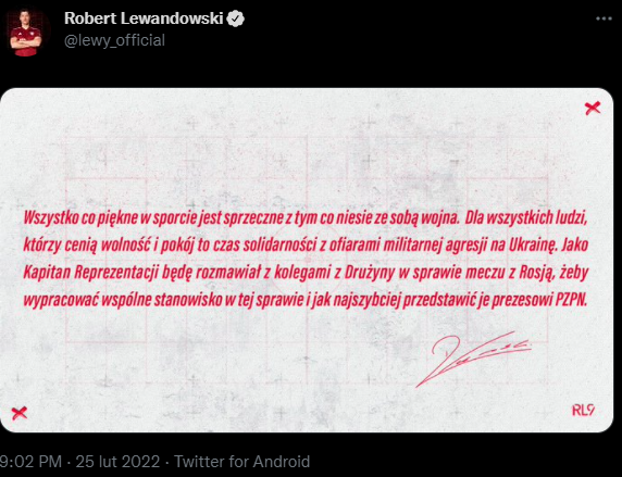 Długo czekaliśmy na zabranie głosu przez kapitana reprezentacji Polski w najważniejszej sprawie. Za miesiąc ma odbyć się barażowy mecz z Rosją, tymczasem rzeczywistość od czwartkowego poranka jest kompletnie inna. Dzisiaj Robert Lewandowski zabrał głos w tej sprawie i... nadal nic nie wiemy.
