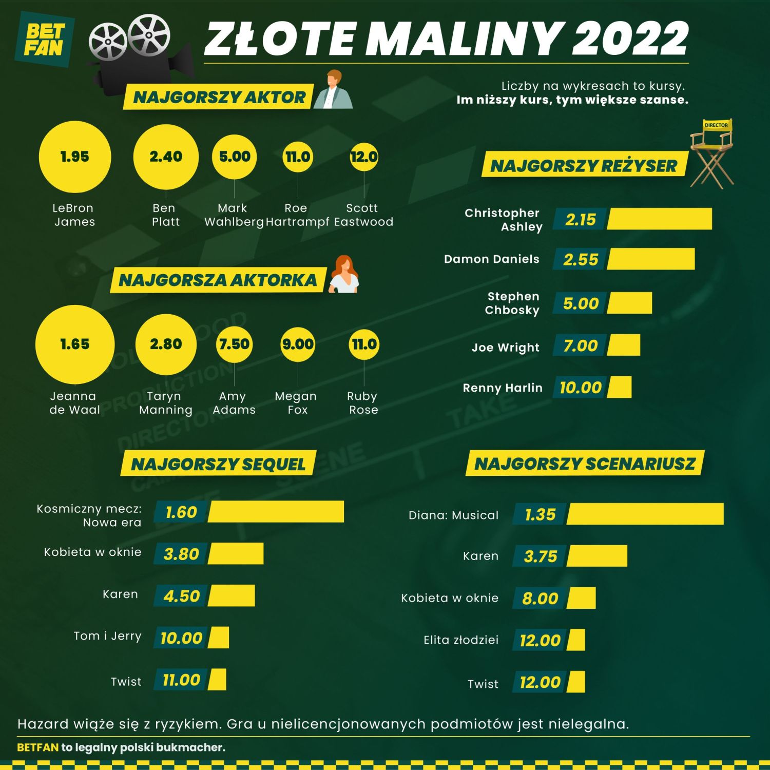 Złote Maliny przyznawane są w przeddzień Oscarów. Widzowie mogą je uznać za oficjalne potwierdzenie straconego czasu lub/i pieniędzy poświęconych „nagrodzonym” produkcjom. Zdaniem BETFAN film, w którym LeBron James zagrał obok Królika Bugsa i innych rysunkowych postaci ze Zwariowanych Melodii, zdobędzie co najmniej dwie Złote Maliny. Według bukmachera jedna trafi do koszykarza jako najgorszego aktora, a druga przypadnie filmowi w kategorii „Najgorszy remake, sequel lub inspiracja”. Samego Kinga Jamesa może ominąć ta niechlubna nagroda dla najgorszego aktora za sprawą Bena Platta, który zagrał główną postać w dramacie Drogi Evanie Hansenie. Zdaniem bukmachera Platt jest bowiem drugim mocnym kandydatem do statuetki w tej kategorii.