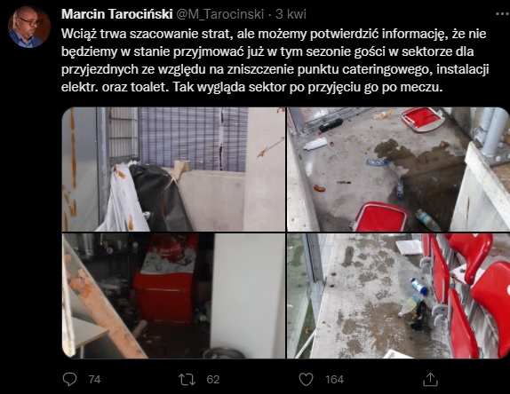 – Cieszymy się z wygranej, ale to co zastaliśmy w sektorze gości nie nastraja optymistycznie. Trwa obecnie szacowanie strat, które wstępnie są określane na około 100 tysięcy złotych. Sektor gości zostanie wyłączony z użytku prawdopodobnie do końca sezonu – pisał na Twitterze po meczu rzecznik prasowy Widzewa, Marcin Tarociński. Widzew u siebie rozegra jeszcze cztery mecze ligowe – Puszcza Niepołomice, Korona, Resovia i Podbeskidzie. Na ten moment wydaje się, że na żadnym z nich nie zobaczymy kibiców gości. A prawdopodobnie kibice trzech z tych klubów chętnie przyjechaliby na to spotkanie.