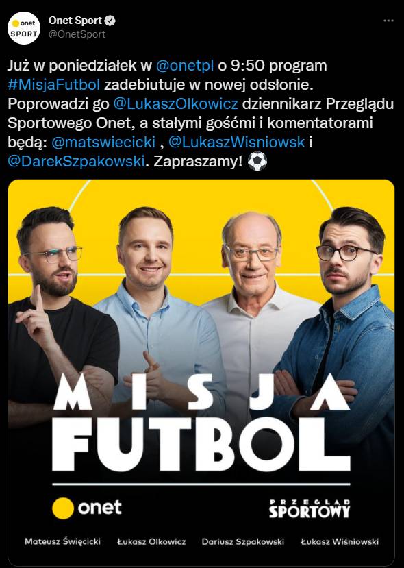 Misja Futbol wraca w zupełnie nowej odsłonie. Prowadzącym zostaje Łukasz Olkowicz, dziennikarz Przeglądu Sportowego Onet, a stałymi gośćmi programu będą Mateusz Święcicki, Łukasz Wiśniowski oraz Dariusz Szpakowski. Pierwszy odcinek w tym składzie już w poniedziałek 2 maja o godzinie 9:50.