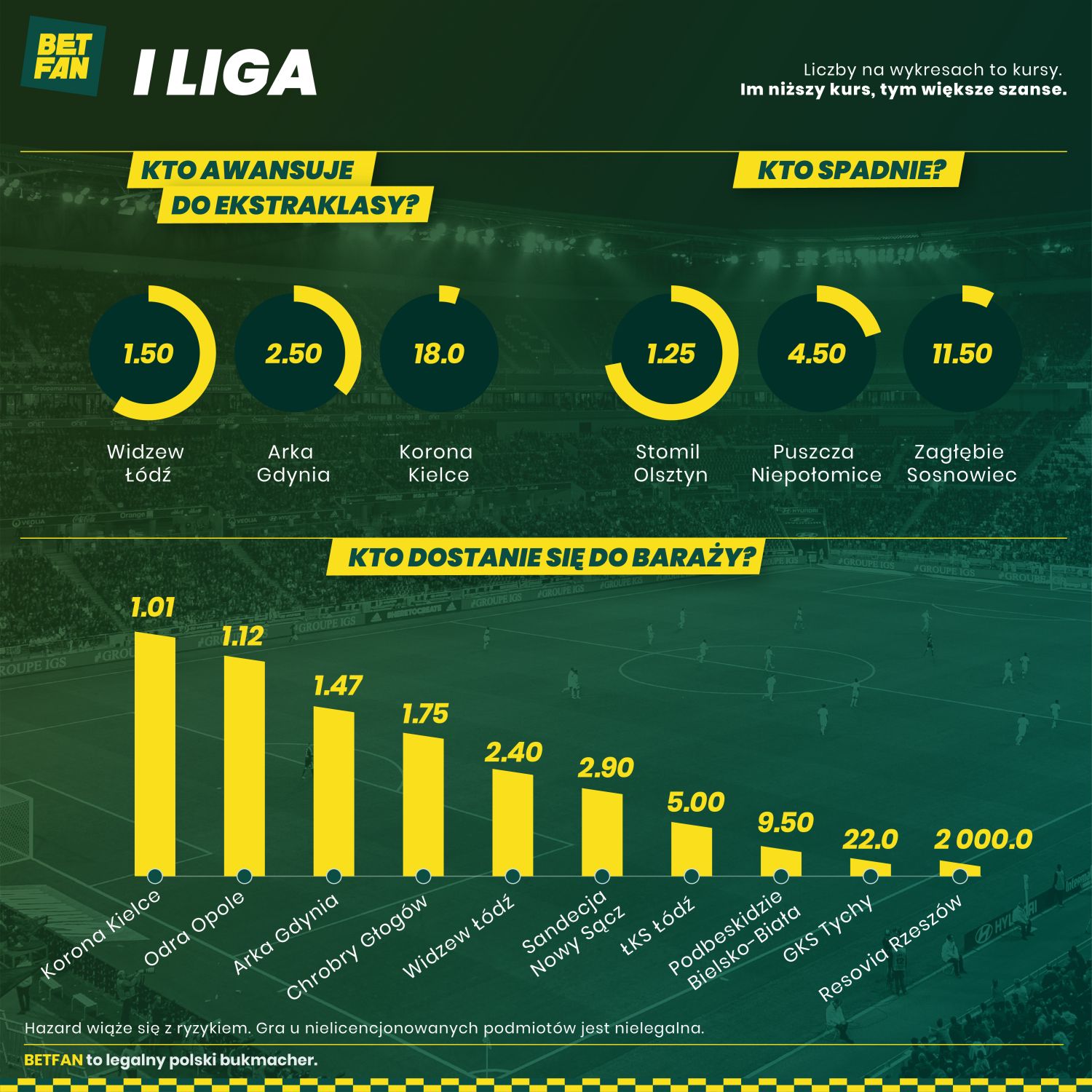 Swoich kibiców uszczęśliwi też Widzew Łódź, który, po latach pięcia się przez kolejne szczeble rozgrywkowe, wywalczy powrót do Ekstraklasy. Zdaniem BETFAN ta drużyna ma największe szanse na zajęcie drugiego, po Miedzi Legnica, miejsca w tabeli premiowanego bezpośrednim awansem. Trzecią lokatę bukmacher daje Arce Gdynia. To jednak oznacza tylko bilet wstępu do walki o status trzeciego beniaminka. Inni najmocniejsi kandydaci do strefy barażowej to: Korona Kielce, Odra Opole i Chrobry Głogów. Mniejsze szanse, choć wciąż niezłe, na znalezienie się gronie drużyn walczących o awans z miejsc 3-6 mają też Sandecja Nowy Sącz i ŁKS Łódź.