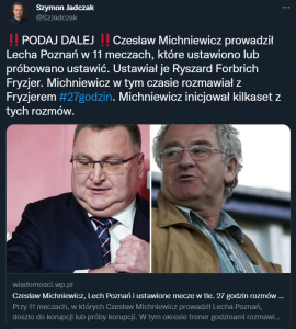 Wypowiedzi Czesława Michniewicza pojawiają się również w artykule Szymona Jadczaka, jednak, jak można było się spodziewać, selekcjoner reprezentacji Polski nadal podtrzymuje, że niewiele pamięta z tamtego okresu, a częste rozmowy z Forbrichem przed i po spotkaniach, które później okazały się ustawione, to tylko nieszczęśliwy zbieg okoliczności. Trudno powiedzieć, jak długo Michniewicz zdoła jeszcze unikać jednoznacznych wypowiedzi, gdyż po artykule dziennikarza Wirtualnej Polski, spore grono osób uznało, że dosyć już milczenia i selekcjoner powinien się jasno rozliczyć ze swojej przeszłości. Wiele kluczowych osobistości polskiej piłki nadal jednak nie przedstawiło swojego stanowiska i jest to przesłanka ku temu, by sądzić, że o całej sprawie, podczas wrześniowych meczów reprezentacji, niewielu będzie pamiętać.