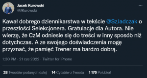Tak jak wspomnieliśmy, po artykule Szymona Jadczaka, nie zabrakło stanowczych opinii. Dziennikarz Canal+ Sport, Tomasz Ćwiąkała, przyznał, że w tych okolicznościach selekcjonerowi trudno będzie się wytłumaczyć z całej sprawy i zasłanianie się kiepską pamięcią nie jest żadnym rozwiązaniem.