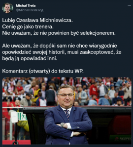 Finalnie, biorąc pod uwagę fakt, że Czesław Michniewicz często bywa gościem programów Kanału Sportowego, chyba trudno było się spodziewać innego rozwiązania. Jak ognia tematu artykułu Szymona Jadczaka unikają także Mateusz Borek, Michał Pol i Tomasz Smokowski, czyli pozostałe osoby zaangażowane w projekt.