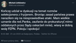 W obliczu negatywnego odbioru tej wiadomości, Listkiewicz zdecydował się nieco spuścić z tonu i zapewnił, że wierzy w słuszność działań prokuratury oraz działanie w dobrej wierze PZPN.