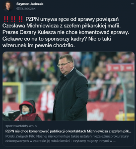 Oczywiście dalecy jesteśmy tutaj od wyrokowania i rzucania sądów, że każda osoba ze środowiska, która nie odniesie się do tej sprawy jest w jakiś sposób powiązana z piłkarską mafią. Reakcja najważniejszych dziennikarzy sportowych w Polsce, a także osób zarządzających polską piłką może jednak silnie wpłynąć na to, jaka przyszłość czeka Czesława Michniewicza oraz czy za kilka tygodni wciąż będziemy o artykule Szymona Jadczaka pamiętać.