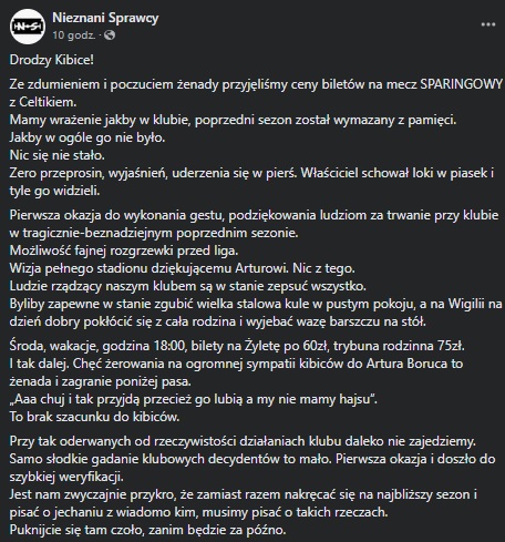 – Przy tak oderwanych od rzeczywistości działaniach klubu daleko nie zajedziemy. Samo słodkie gadanie klubowych decydentów to mało. Pierwsza okazja i doszło do szybkiej weryfikacji – można było przeczytać we wpisie „Nieznanych Sprawców”, czyli profilu kibiców Legii Warszawa. Poniżej wklejamy cały tekst oświadczenia.
