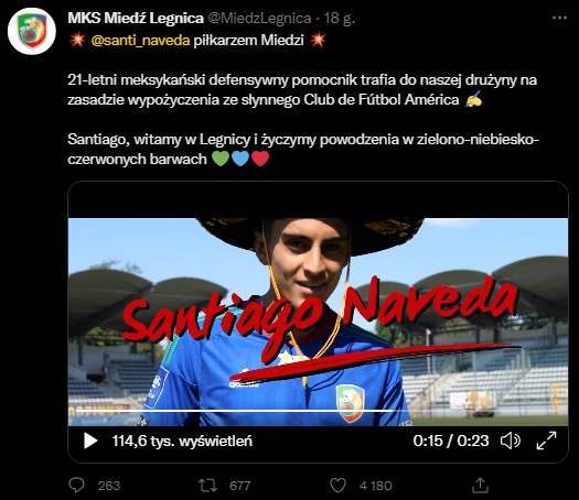 Beniaminek z Dolnego Śląska nowy transfer ogłosił wczoraj o godzinie 18:00. Przez kilkanaście godzin klubowe social media przeżywają prawdziwy „najazd” meksykańskich kibiców. – Potrzebujemy postów po angielsku. Będziecie teraz mieli mnóstwo nowych obserwujących z Meksyku – napisał jeden z nich. Miał racje! Tylko na Twitterze post dotyczący transferu zebrał ponad cztery tysiące polubień i zanotował niemal 115 tysięcy wyświetleń! Dla porównania transfer Angelo Henriqueza z Chile miał niecałe 150 polubień, a mówimy o graczu z nieporównywalnie większym CV od Navedy.