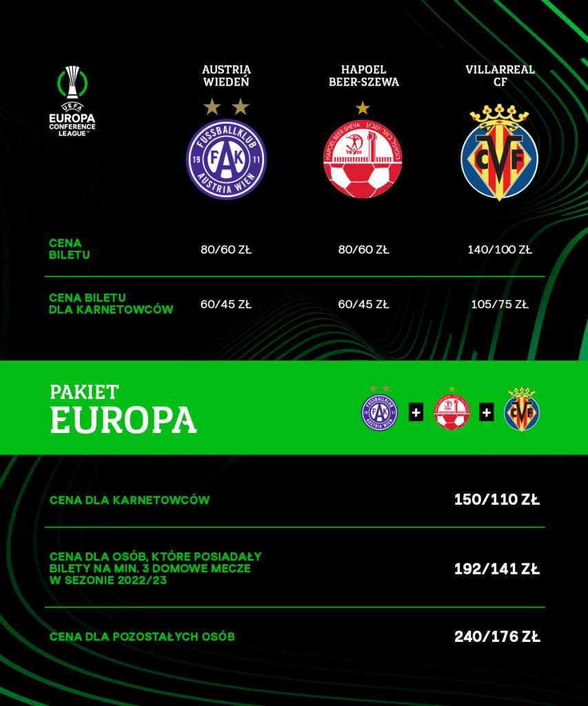 Lech Poznań zmierzy się z Austrią Wiedeń, Hapoelem Beer-Szewa i Villarreal. O ile atrakcyjność dwóch pierwszych przeciwników nie jest najwyższa, o tyle w trzecim przypadku mówimy o topowym klubie. Stąd też ceny pojedynczych biletów są zróżnicowane. Karnetowicze zapłacą 45 lub 60 złotych za dwóch pierwszych rywali oraz 75 lub 105 za półfinalistę ostatniej Ligi Mistrzów.