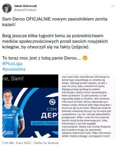 Przypomnijmy, że rosyjskie oraz białoruskie drużyny zostały wykluczone przez CEV oraz FIVB ze wszystkich rozgrywek międzynarodowych i międzyeuropejskich. Oznacza to jednocześnie, że Sam Deroo nie będzie miał okazji wystąpić w przyszłorocznych pucharach.