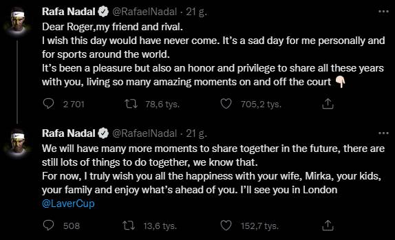 Posty opublikowali dwaj najwięksi rywale Rogera Federera, czyli Rafa Nadal oraz Novak Djoković.