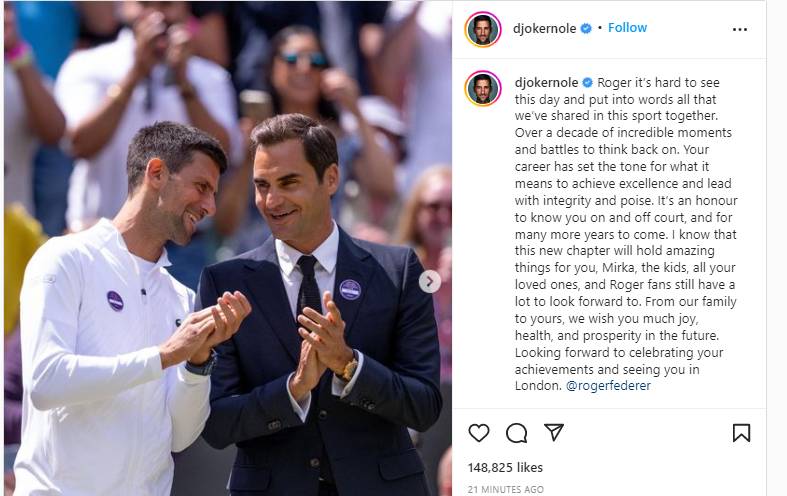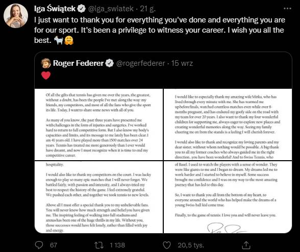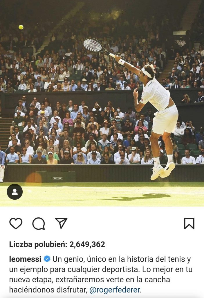 Nikt nie ma wątpliwości, że Roger Federer jest ikoną tenisa XXI wieku. Potwierdzają to wpisy osób, które nie są związane z tenisem, ale mają olbrzymi wpływ na inne dyscypliny lub dziedziny. Post opublikował Leo Messi, który napisał: Geniusz, najlepszy w historii tenisa. Wzór dla każdego sportowca. Wszystkiego najlepszego na nowym etapie życia.