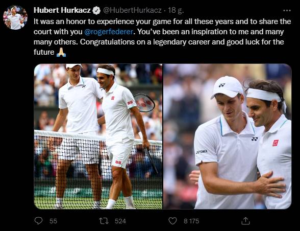 Post opublikował również Hubert Hurkacz. Warto zaznaczyć, że polski tenisista był ostatnim rywalem Rogera Federera na wielkoszlemowym turnieju. Hubert wygrał ćwierćfinałowe starcie na Wimbledonie w 2021 roku.