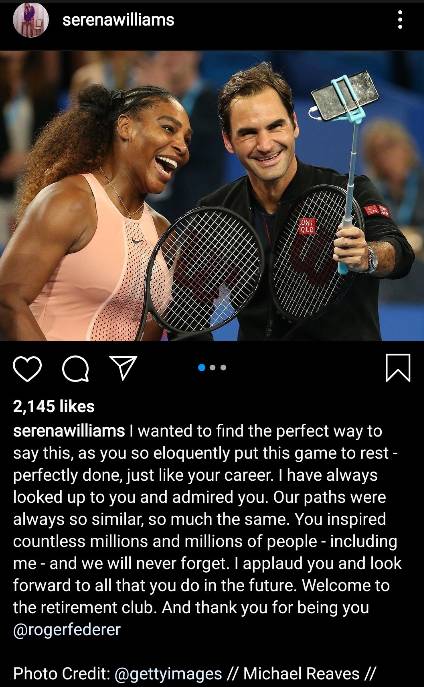 Wybitniej kariery pogratulowała Szwajcarowi mistrzyni kobiecego tenisa – Serena Williams, która niedawno również zdecydowała się na zakończenie kariery, więc przywitała Federera w „retirement club”.