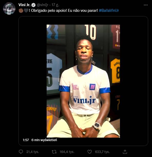 Specjalny komunikat opublikował Vinicius Junir, który powiedział: Dopóki kolor skóry jest ważniejszy od błysku w oczach, będzie wojna. Mam tę sentencję wytatuowaną na swoim ciele. Mam tę myśl na stałe w mojej głowie. I mam również podstawy w moim życiu, które przekształcają tę filozofię w rzeczywistość.