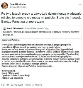 Warto zaznaczyć, że publicznie głos zabrał także wspominany autor felietonu, Paweł Hochstim.