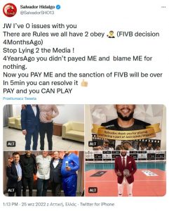 Swoje zdanie na temat całej sytuacji wyraził także sam zainteresowany, a więc Salvador Hidalgo Oliva. Obecny siatkarz Olympiakosu Pireus na swoim oficjalnym profilu na Twitterze zwrócił się bezpośrednio do prezesa Jastrzębskiego Węgla. – Są zasady, których wszyscy przestrzegamy. Przestań kłamać do mediów. Cztery lata temu nie zapłaciłeś mi i nie obwiniałeś mnie za nic. W pięć minut możesz to rozwiązać. Zapłać i możesz grać – napisał 36-letni przyjmujący. Co ciekawe, Oliva jednocześnie umieścił we wpisie kilka zdjęć z czasów gry w Jastrzębskim Węglu, w tym jedno z prezesem Adamem Gorolem.