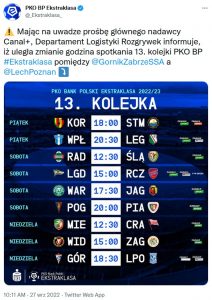Spotkanie 13. kolejki PKO Bank Polski Ekstraklasy pomiędzy Górnikiem Zabrze a Lechem Poznań miało odbyć się w niedzielę 16 października o godzinie 17:30. Główny nadawca rozgrywek, telewizja CANAL+ przesunęła jednak mecz o godzinę później i rozpocznie się on o 18:30.
