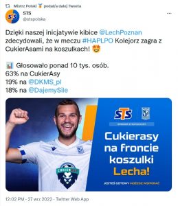 Z inicjatywą oddania miejsca na koszulkach Lecha wyszedł sam STS. W poprzednim tygodniu klub przeprowadził głosowanie – w nim kibice wybrali logo organizacji, która pojawi się na strojach Kolejorza w Izraelu. W głosowaniu udział wzięli Fundacja DKMS, Fundacja Dajemy Dzieciom Siłę oraz CukierAsy. Zwycięzcą okazali się ci ostatni.