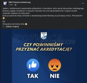 Zwiększenie zaangażowania kibiców w mediach społecznościowych wydaje się nie być wcale prostą sprawą. O tym, że nie jest to żadna filozofia postanowiła przekonać wszystkich Kotwica Kołobrzeg. Na facebookowym profilu lidera eWinner 2 Ligi pojawiło się bowiem głosowanie dotyczące tego, czy jeden z dziennikarzy powinien otrzymać akredytację na wtorkowe spotkanie z Garbarnią.